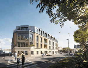 Entre la douceur de la place Schœlcher et l’animation des rues avoisinantes, “Les Jardins Schœlcher” dévoilent une partition architecturale élégante d’inspiration classique. Dans un ensemble harmonieux et cohérent, elle propose une réalisation innovante parfaitement intégrée dans son environnement. Résolument urbaines sur les rues de l’Amiral Courbet et Gabriel Péri, les façades privilégient les lignes pures et le subtil mélange des matériaux nobles et des teintes chaudes, l’enduit minéral blanc, la brique et les serrureries finement ouvragées anthracite, dans un prolongement respectueux du caractère du quartier. Les larges ouvertures vitrées donnent la cadence et permettent à la lumière d’inonder les intérieurs. Côté place, la façade se métamorphose et les superbes bow-windows types verrières se donnent à lire comme de véritables ateliers d’artistes. Les toits mansardés en zinc découpent une silhouette raffinée et contemporaine sur l’horizon.