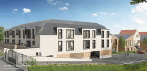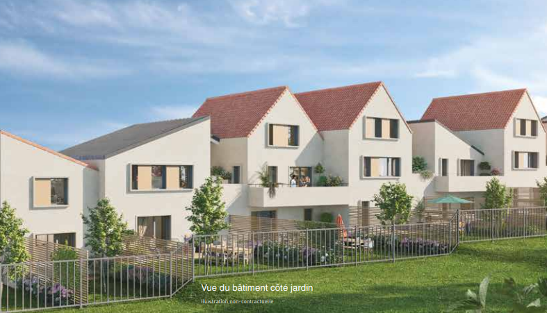 L’Esseine étire ses bâtiments en pente douce pour créer un îlot de tranquillité à l’abri des regards, séparé de la rue par un petit collectif de trois étages, avec un rez-de-chaussée réservé aux stationnements. L’immeuble à taille humaine accueille 18 appartements. Les 22 autres logements se répartissent dans des constructions intimistes, avec chacune leur caractère. Une voie de circulation dessert l’ensemble des habitations. Leur architecture est un doux mélange de classicisme et de formes épurées contemporaines, avec des habillages dans des tons clairs, l’utilisation de bois ajouré et des parements rouge brique. L’alternance des toitures en tuile rouge et en bac acier imitation zinc donnent du rythme à cet ensemble à la fois fonctionnel et moderne.